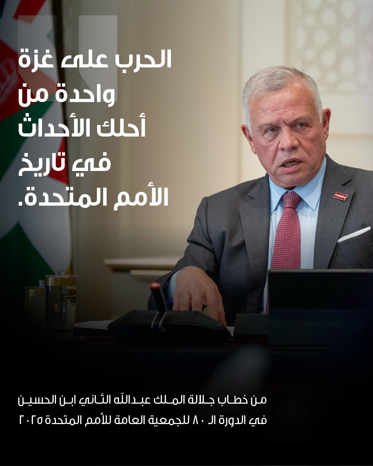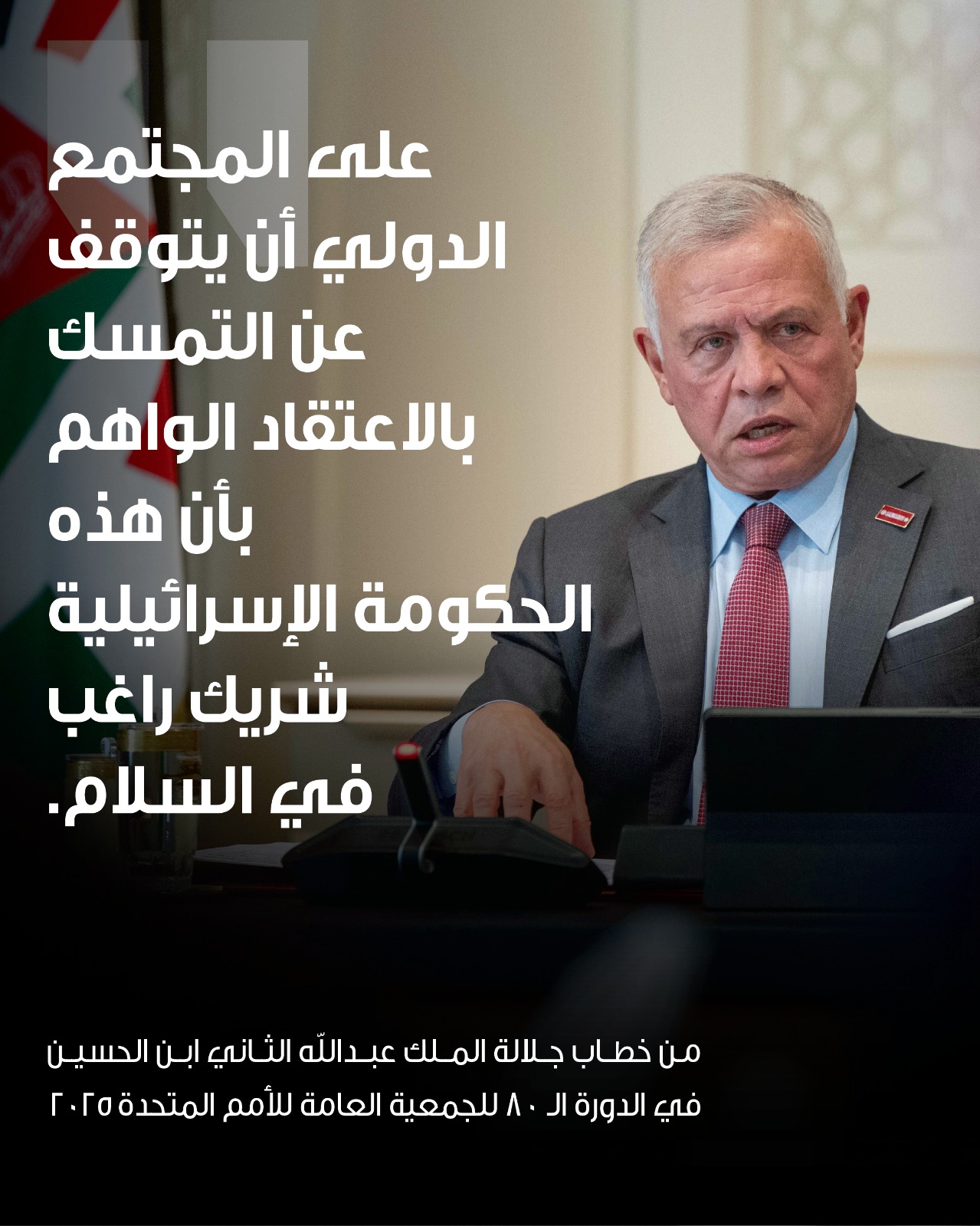 الملك: الدعوات الاستفزازية بما يسمى بـ "إسرائيل الكبرى" لا يمكن أن تتحقق إلا بالانتهاك الصارخ لسيادة وسلامة أراضي البلدان المجاورة لها، وهذا أمر لا يمكن القبول به.